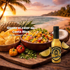 Una mezcla fresca de mango maduro, piña jugosa y coco, combinada con chile panameño (Scotch Bonnet) cultivado bajo el sol de Costa Rica.