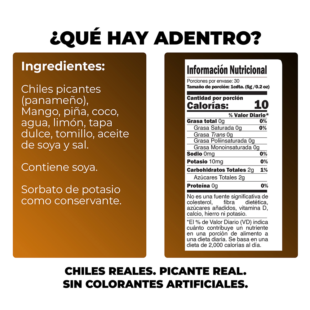 Una mezcla fresca de mango maduro, piña jugosa y coco, combinada con chile panameño (Scotch Bonnet) cultivado bajo el sol de Costa Rica.